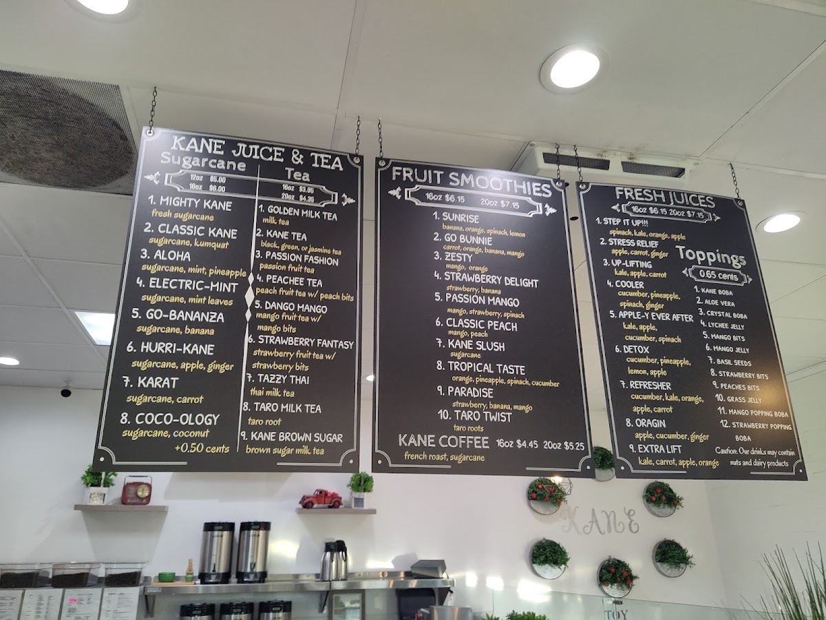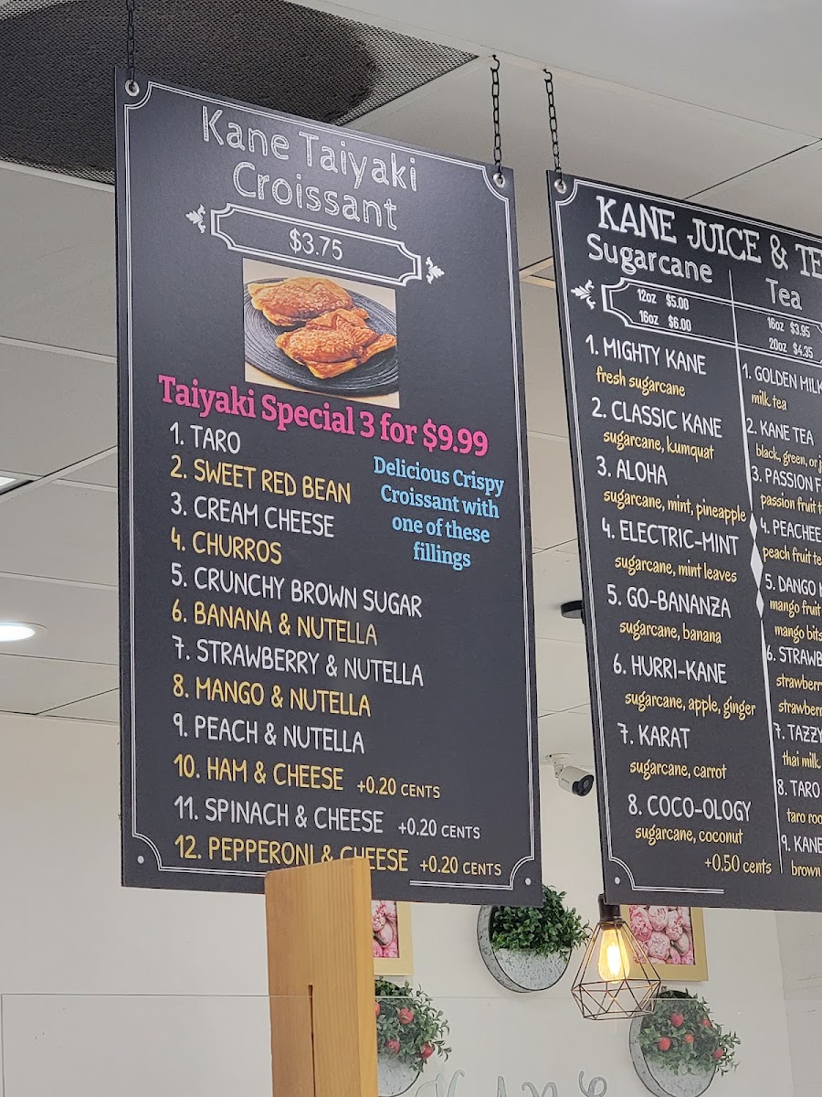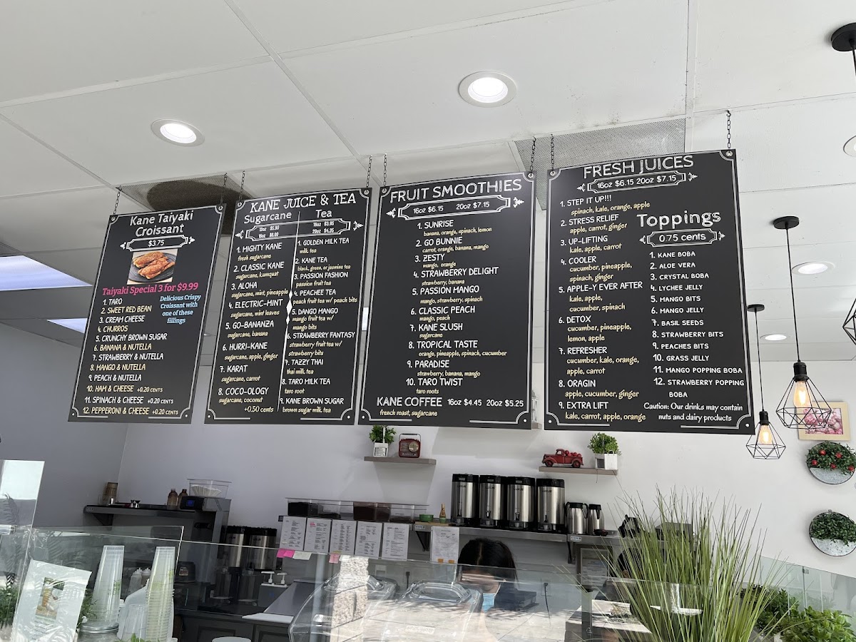 Kane Juice & Tea at 17122 Slover Ave offers a vibrant and diverse menu that caters to both juice enthusiasts and pastry lovers. Their Sugarcane lineup is a standout, featuring inventive options like Mighty Kane, Karat, Coco-Ology, Electric-Mint, and Aloha, each promising a refreshing and energizing experience. For coffee aficionados, the straightforward yet robust Kane Coffee delivers a satisfying pick-me-up. The Kane Taiyaki Croissant selection is playful and indulgent, with choices such as Ham & Cheese Taiyaki Croissant, Spinach & Cheese Taiyaki Croissant, Pepperoni & Cheese Taiyaki Croissant, Cream Cheese Taiyaki Croissant, and Churros Taiyaki Croissant, blending flaky pastry with creative fillings. Fans of K-pop-themed beverages will find the BTS Special Drinks, including the Coco-Dynamite Smoothie and Purple "U" Tea, both fun and flavorful. For those seeking fresh, fruity options, the Fresh Juices-Up-Lifting, Refresher, DetoxCooler, and Extra Lift-offer a refreshing boost. Tea lovers are equally well-served with selections like Kane Tea, Tazzy Thai, Strawberry Fantasy Peachee Tea, and Matcha Tea, each providing a delicate balance of flavor and aroma. Finally, the Fresh Smoothies such as Paradise, Taro Twist, Go Bunnie Passion Mango, and Sunrise round out the menu, delivering creamy, fruit-forward indulgence. Overall, Kane Juice & Tea combines inventive drinks and pastries with approachable favorites, making it a must-visit spot for anyone in Fontana looking for a sweet, refreshing, or caffeinated treat.