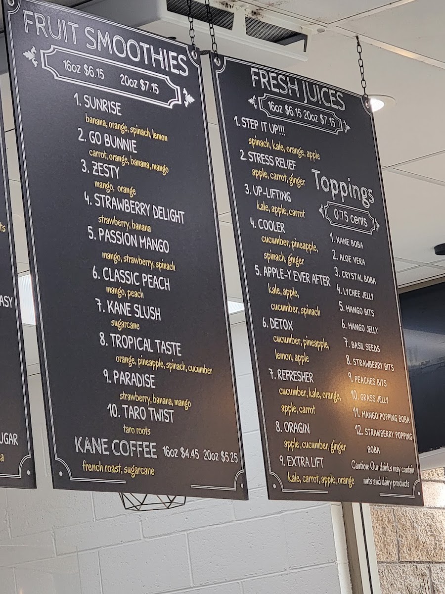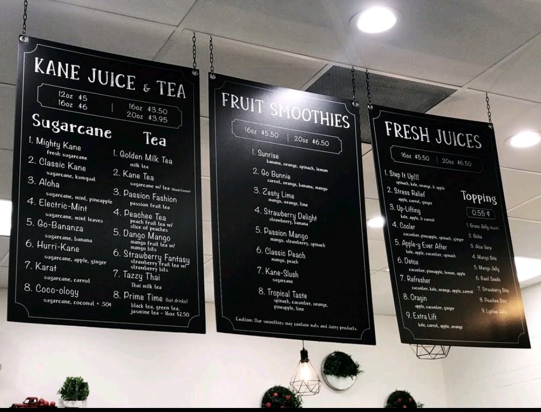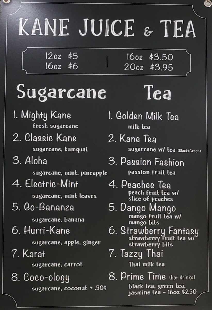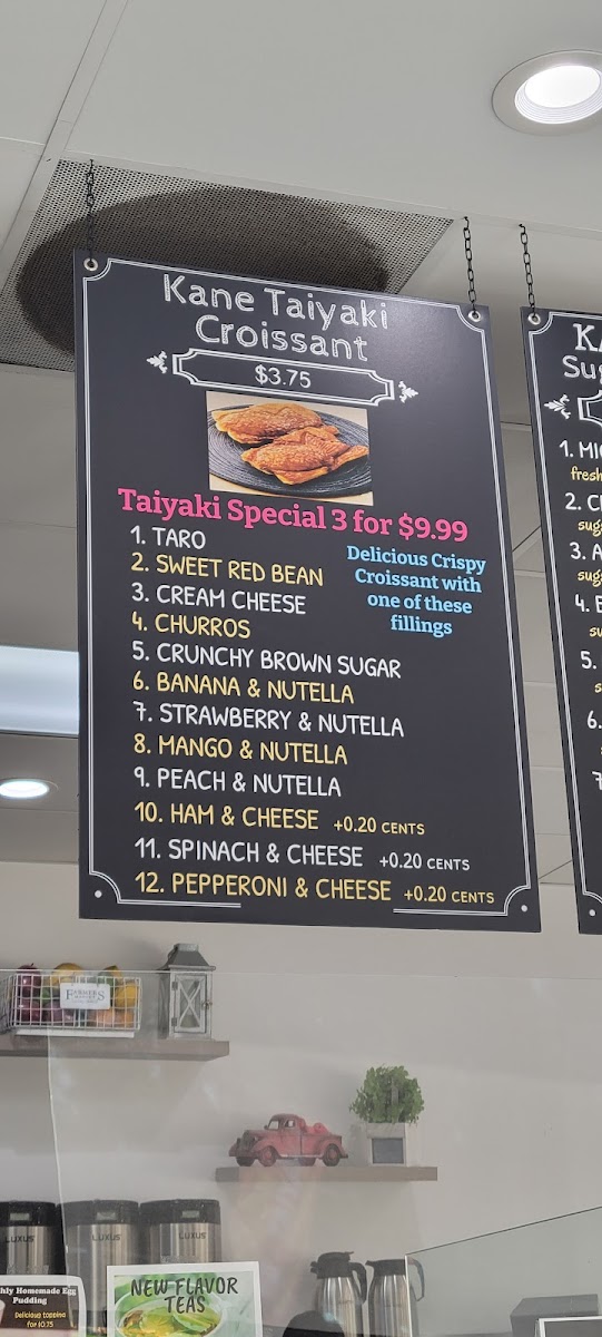Kane Juice & Tea at 17122 Slover Ave offers a vibrant and diverse menu that caters to both juice enthusiasts and pastry lovers. Their Sugarcane lineup is a standout, featuring inventive options like Mighty Kane, Karat, Coco-Ology, Electric-Mint, and Aloha, each promising a refreshing and energizing experience. For coffee aficionados, the straightforward yet robust Kane Coffee delivers a satisfying pick-me-up. The Kane Taiyaki Croissant selection is playful and indulgent, with choices such as Ham & Cheese Taiyaki Croissant, Spinach & Cheese Taiyaki Croissant, Pepperoni & Cheese Taiyaki Croissant, Cream Cheese Taiyaki Croissant, and Churros Taiyaki Croissant, blending flaky pastry with creative fillings. Fans of K-pop-themed beverages will find the BTS Special Drinks, including the Coco-Dynamite Smoothie and Purple "U" Tea, both fun and flavorful. For those seeking fresh, fruity options, the Fresh Juices-Up-Lifting, Refresher, DetoxCooler, and Extra Lift-offer a refreshing boost. Tea lovers are equally well-served with selections like Kane Tea, Tazzy Thai, Strawberry Fantasy Peachee Tea, and Matcha Tea, each providing a delicate balance of flavor and aroma. Finally, the Fresh Smoothies such as Paradise, Taro Twist, Go Bunnie Passion Mango, and Sunrise round out the menu, delivering creamy, fruit-forward indulgence. Overall, Kane Juice & Tea combines inventive drinks and pastries with approachable favorites, making it a must-visit spot for anyone in Fontana looking for a sweet, refreshing, or caffeinated treat.
